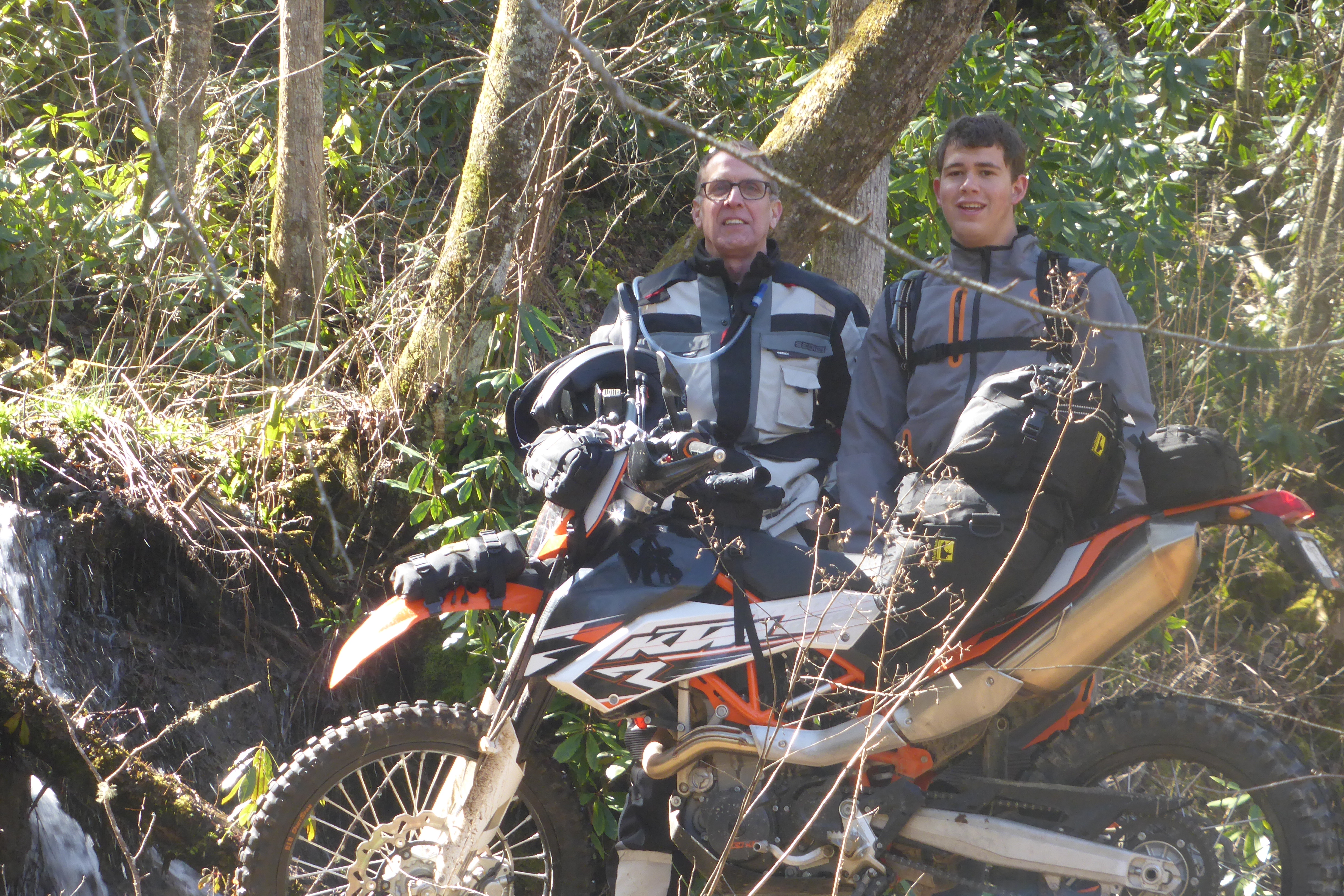 Rich took the lead and I was perfectly happy with the pace he set. The trails were wet and quite slippery at times. The 119o weighed about 650 lbs and didn’t track very well in the mud. But, it really was Sammy’s trip so he quickly took the lead… He and the 690 were right at home blazing along a steep drop off at 50+ MPH. I had visions of rounding a corner and finding him on the valley floor… This would be the pace for the rest of the trip.