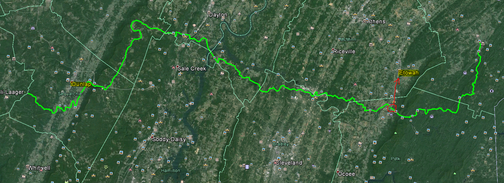 Our goal for the second half of the day was to reach Dunlap, TN. We fell short by quite a few miles, but made it to the Hiwassee State River Recreation Area. The trail coming out of the Rec Area dropped us on US 411 just south of Etowah, TN.